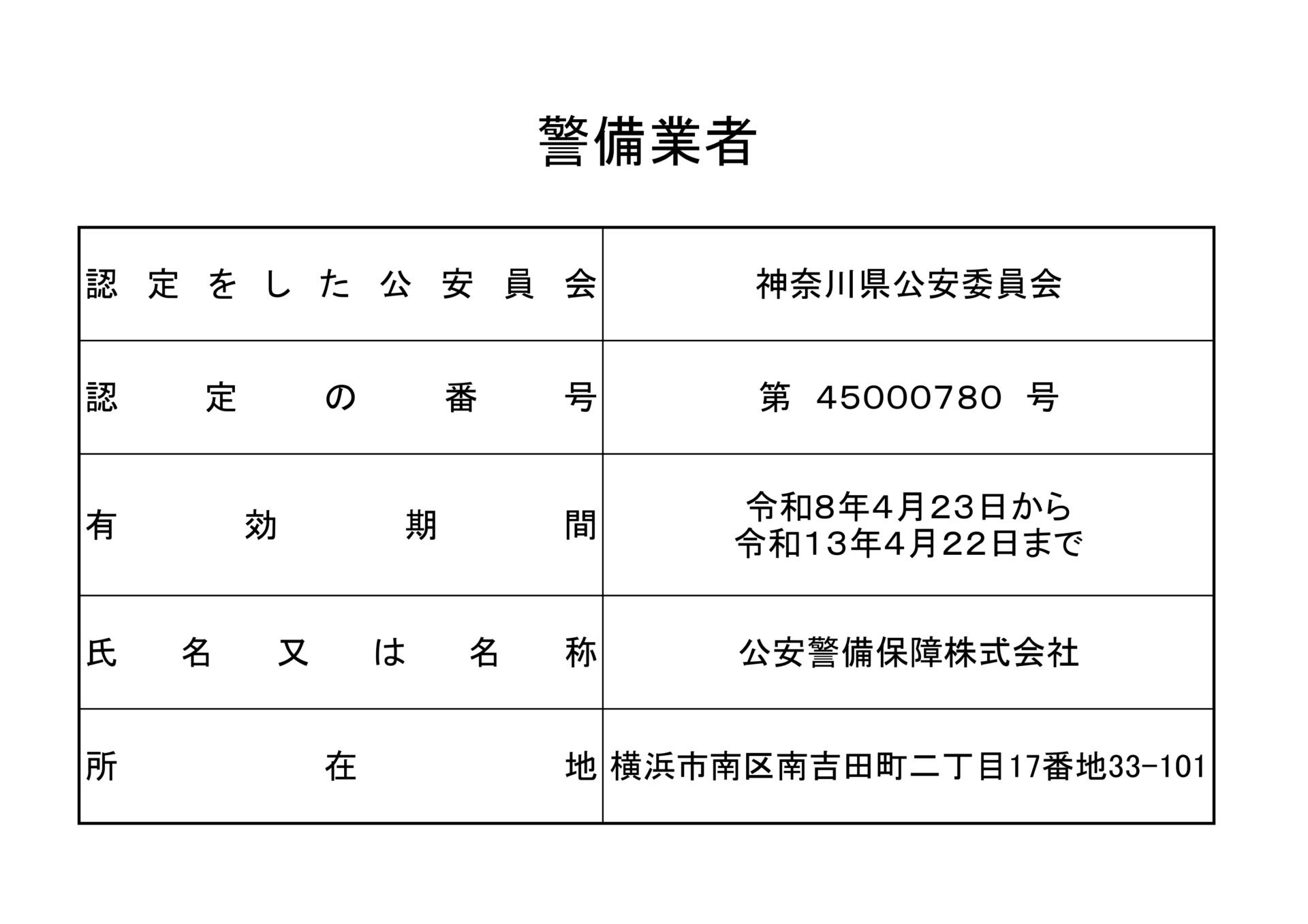 | 会社名 | 公安警備保障株式会社 神奈川県公安委員会認定第45000780号 |